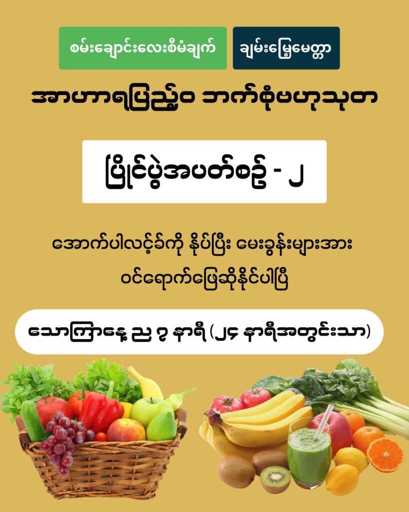 အာဟာရပြည့်ဝ ဘက်စုံဗဟုသုတ အောက်ပါလင့်ခ်ကို နှိပ်ပြီး မေးခွန်းများအားဝင်ရောက်ဖြေဆိုနိုင်ပါပြီ ဖြေဆိုရန် လင့်ခ် – https://ee.kobotoolbox.org/single/a7f552bb61ce670cabfb450654bdfd8d